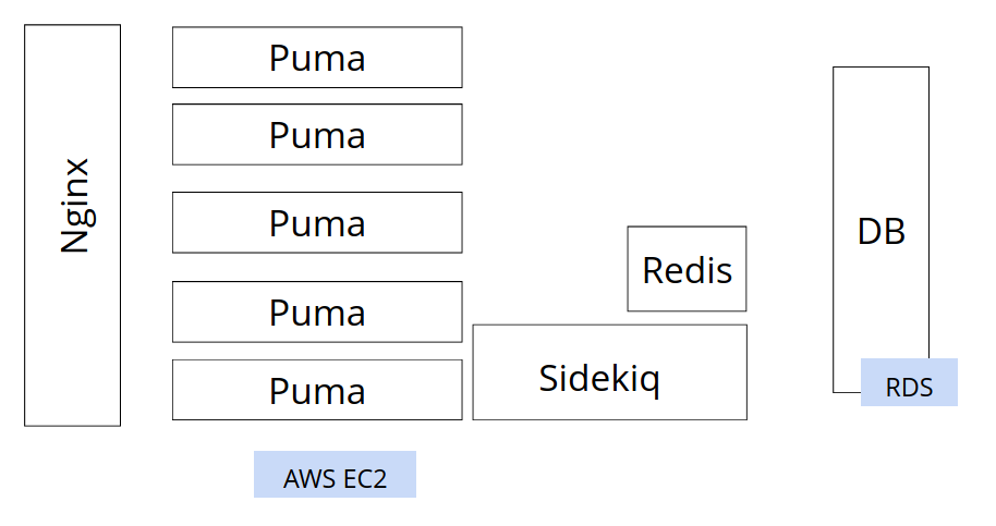 That is not easy to achieve in this setup. We can’t add copies of this server, because the Nginx and Redis have to remain single. We need to increase the number of Puma instances by a lot, and the Sidekiq instances by a little. The architecture needs to change.